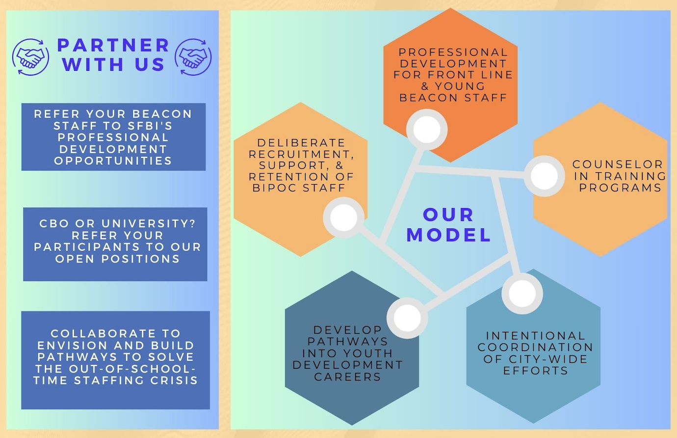 Employing a strategic workforce development approach, SFBI’s workforce development efforts will build programs and pathways to recruit, train, and support youth development professionals to address the specific, immediate and long term staffing needs of youth-serving CBOs in San Francisco.